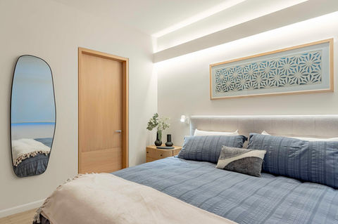 Acabados cálidos, carpintería en madera clara e iluminación indirecta